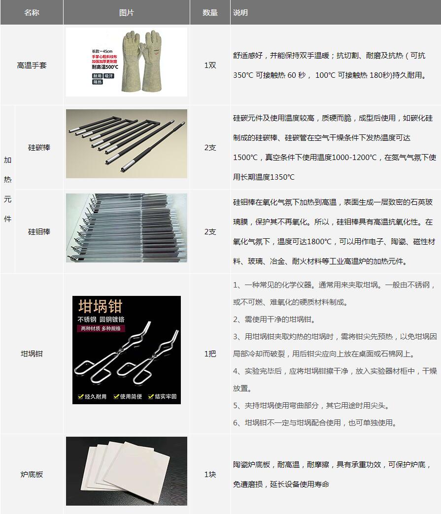 可選配件 | 門堵,坩堝鉗,高溫手套,防損加熱原件,熱電偶,墊磚,碳化硅底板,耐熱鋼底板 |