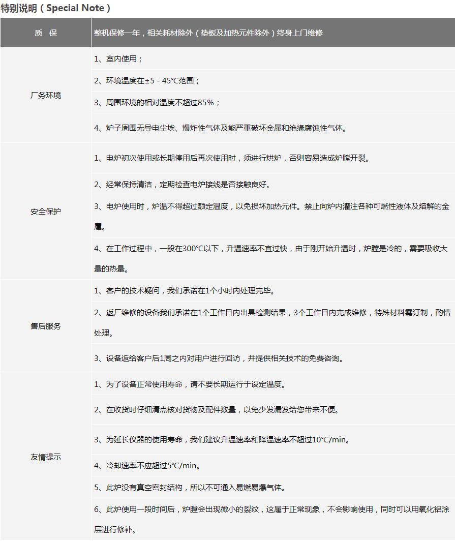 注意事項 | · 為兩不影響儀器的使用壽命,我們建議最大升溫速率和降溫速率為10℃/min · 此箱式爐使用一段時間后,爐膛會出現(xiàn)微小的裂紋,這屬于正常現(xiàn)象,不會影響使用,同時可以用氧化鋁涂層進行修補 · 不建議通入腐蝕性氣體,如果要通入強腐蝕性氣體如S、Na等,請?zhí)崆案嬷?,我們將對爐膛進行特殊處理 |